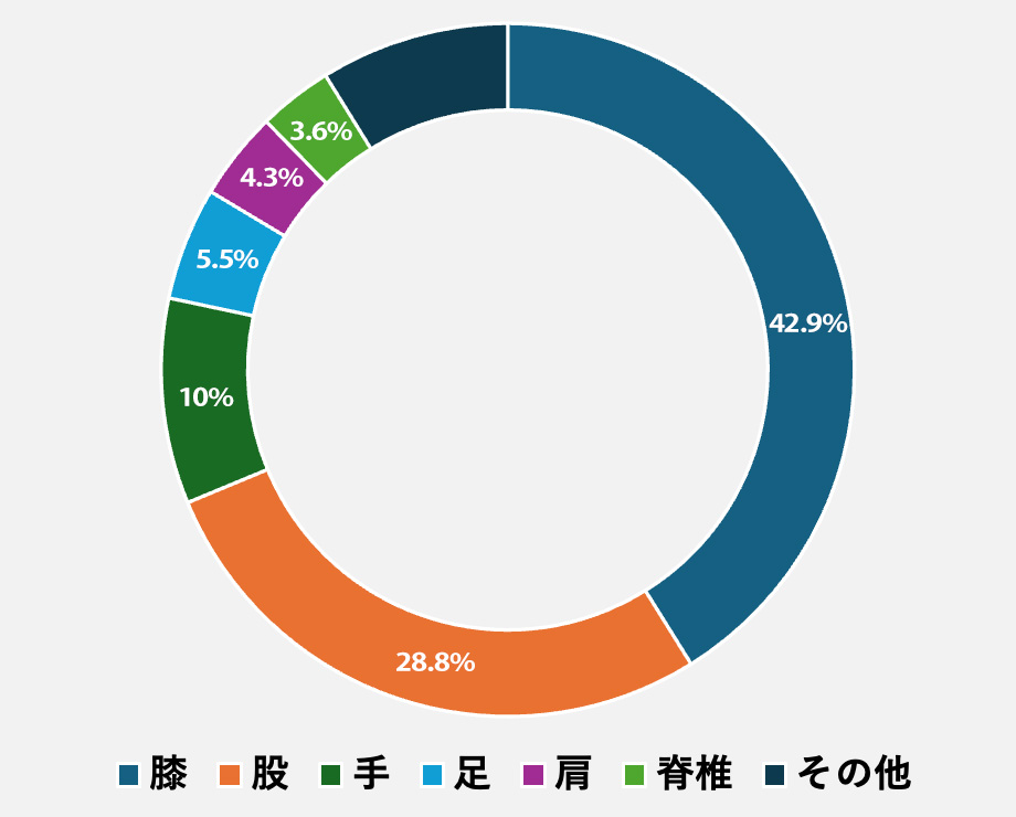 中でも膝関節疾患の方が約4割、股関節疾患の方が約3割となります。